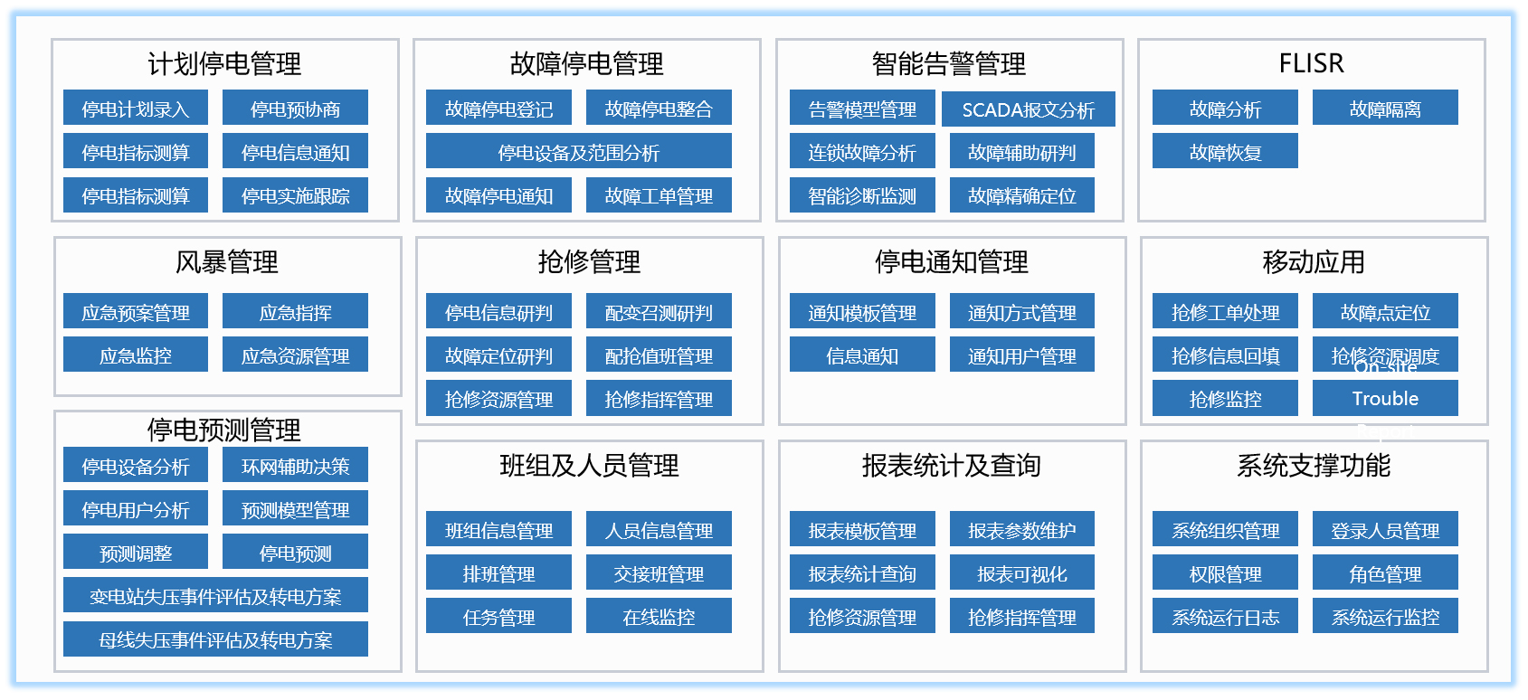 OMS系統(tǒng)基于擁有自主知識產權的UEP Cloud研發(fā)的云化微服務架構體系WEB軟件信息系統(tǒng),系統(tǒng)以電網(wǎng)停電管理全過程處理為業(yè)務主線,包括故障智能診斷、故障綜合研判、派工輔助決策及自動調度、搶修過程全景監(jiān)視與網(wǎng)絡交互、風暴與停電預測、風暴主動停電計劃智能生成、主動停電通知、巡檢任務自動分發(fā)等功能,實現(xiàn)停電管控的全過程可視化統(tǒng)一處理、統(tǒng)一監(jiān)控、統(tǒng)一調度、統(tǒng)一反饋管理,減少了客戶的停電時間,大大提高了客戶服務質量。