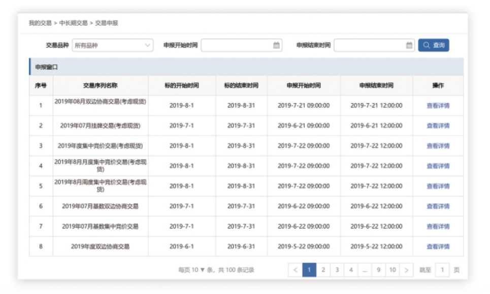 按照年度/月度開展市場雙邊協(xié)商、市場掛牌交易、年度集中交易、月度集中交易等交易品種的交易申報操作,支持跨省區(qū)和省內(nèi)的交易開展。